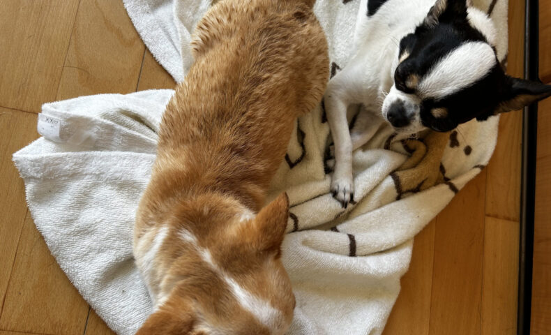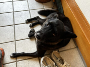 さあメインイベントです。幸吉はなにか感づいて観念した様子でお風呂場にご案内しました。雨の日は濡れるのを嫌がって散歩も拒否する彼ですからもちろんお風呂も嫌です。シャワーをかけてワシャワシャと洗いまして、緩めシャワーで濯ぎました。その間幸吉くんは”俎板の鯉”状態、反抗もせずひたすら耐えておりました。